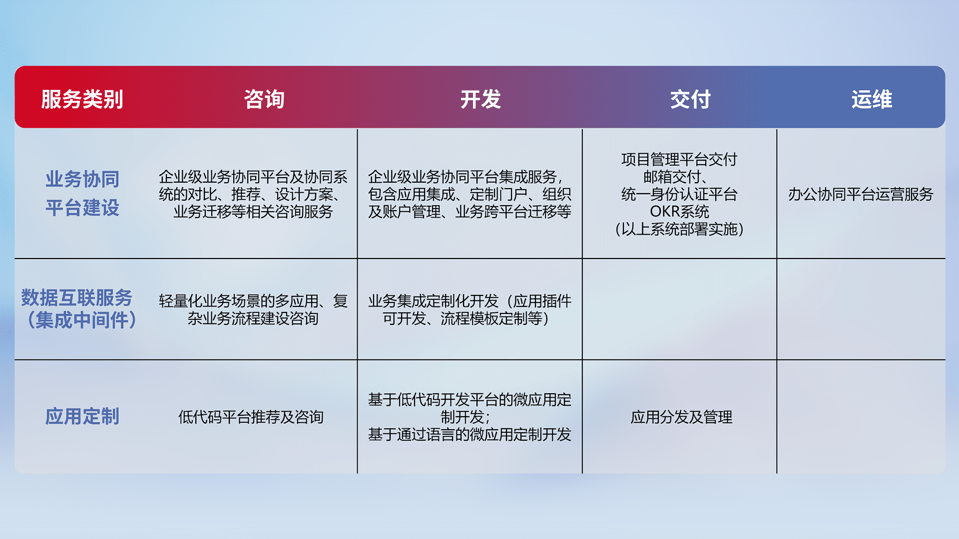 针对钉钉、、、、企微、、、、IDaas等平台级产品提供产品的规划、、方案、、交付、、、定制化开发等服务,,,,实现如统一协同办公、、智能客户服务、、、、混合会议管理、、、、智能数据查询、、、、等业务场景,,实现数字化转型。。。。